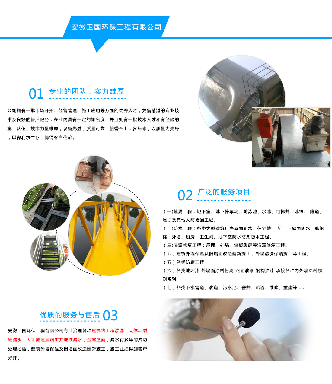 安徽衛(wèi)國(guó)環(huán)保工程有限公司專(zhuān)業(yè)治理各種建筑物工程滲漏,大體積裂縫漏水,大壩隧道涵洞礦井地鐵漏水,金屬屋面,漏水有多年的成功處理經(jīng)驗(yàn),建筑外墻保溫及舊墻面改造翻新施工,施工業(yè)績(jī)得到客戶(hù)好評(píng)。